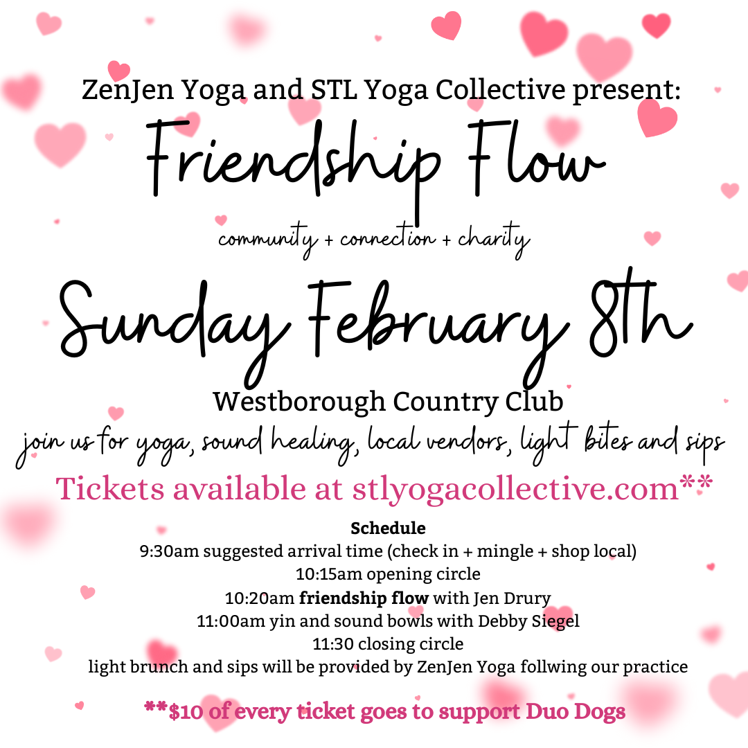 Join us for a day filled with friends, smiles, shopping, laughter, movement, mindfulness, and sound healing! The beautiful Westborough Country Club will be transformed into a space where you can reset, and rejuvenate after the Holidays with other lovely women in the community! Plan to arrive early in order to take advantage of complimentary coffee and herbal teas, while you mingle and shop some of the best local vendors Saint Louis has to offer! Then, settle onto your mat for a gentle and inspiring Friendship Flow with the incredibly talented, up and coming instructor, Jen Drury! Once you work up a bit of a sweat, you will relax with soft stretching (Yin), and sound bowls with the lovely Debby Siegel. Stick around and browse the vendors afterwards, while enjoying light bites and sips compliments of ZenJen Yoga!